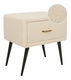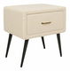S týmto nočným stolíkom vytvoríte vo svojej spálni očarujúcu atmosféru. Stolík je vyrobený z na dotyk príjemnej buklé tkaniny, ktorá vďaka svojmu dizajnu určite upúta pozornosť. Béžovú farbu čalúnenia dopĺňajú čierne nohy vyrobené zo železa, ktoré zaisťujú stabilitu. Zásuvku s úchytkou v ružovozlatej farbe, ktorá je súčasťou stolíka, možno využiť ako odkladací priestor na knihy či iné drobnosti.