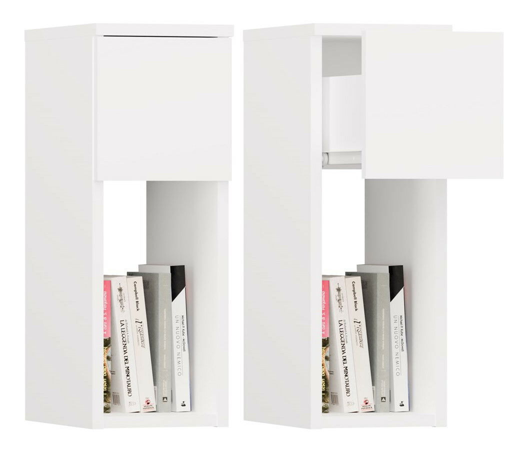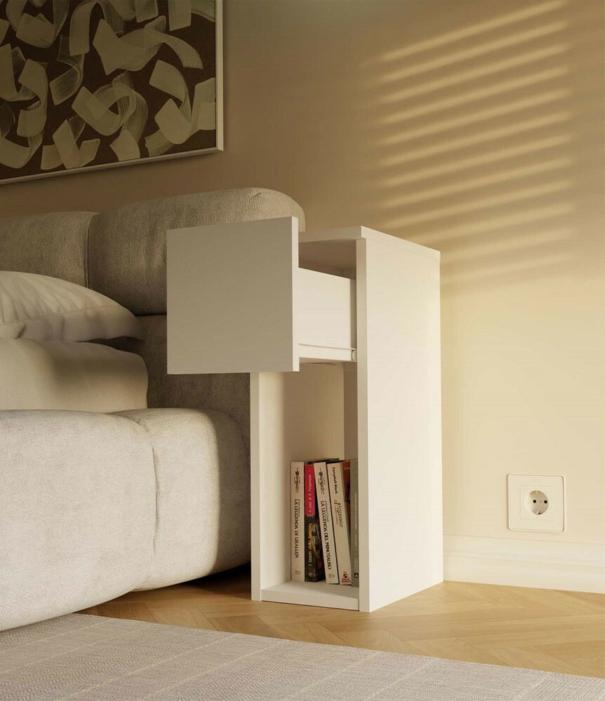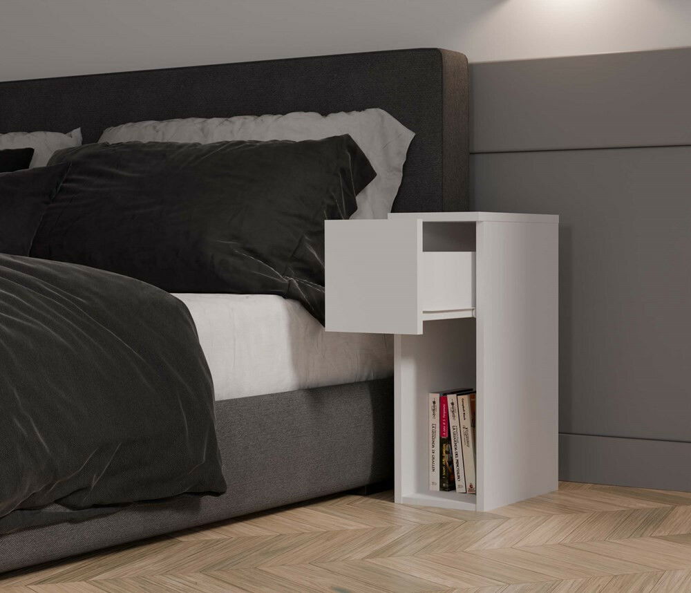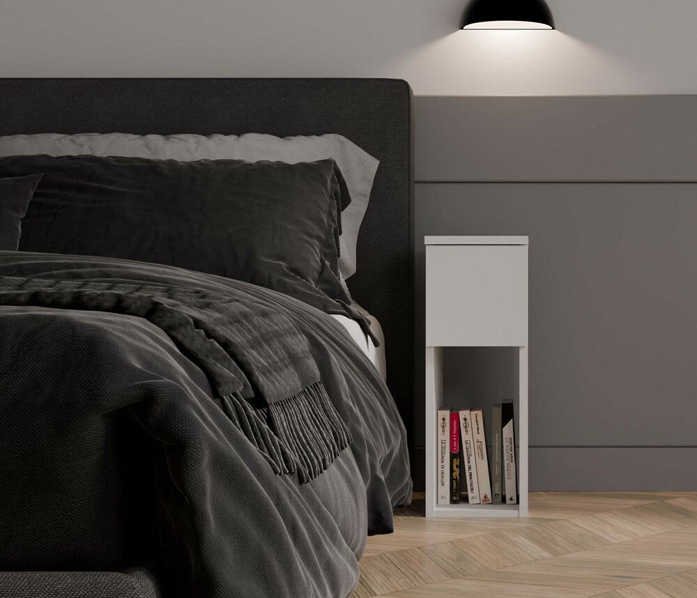 Nočný stolík Gustaban 1 je praktickým a estetickým doplnkom každej spálne, ktorý kombinuje moderný dizajn s funkčnosťou. Jeho elegantný biely povrch dodáva interiéru sviežosť a ľahkosť, pričom bezúchytové fronty zabezpečujú minimalistický vzhľad. Stolík je vybavený otvorenou poličkou a zásuvkou, ideálnym na uskladnenie kníh, telefónov či nabíjačiek, pričom jeho kompaktné rozmery (šírka 20 cm, hĺbka 30 cm, výška 55 cm) ho robia vhodným aj do menších priestorov. S kvalitným spracovaním a starostlivosťou o detaily je Gustaban 1 skvelou voľbou pre každú spálňu.
