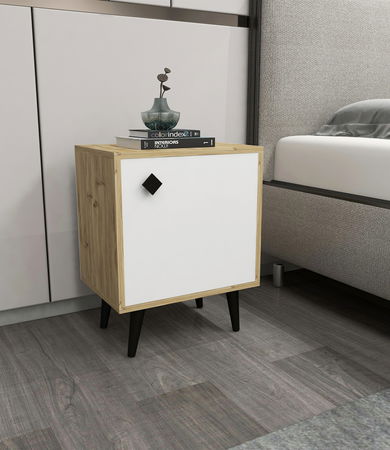 Nočný stolík - Helsinki je elegantný kus nábytku, ktorý doplní váš spálňový interiér. Vysoký 65 cm, široký 45 cm a hlboký 35 cm, ponúka dostatok miesta na uloženie vecí, ktoré potrebujete mať v dosahu počas noci. Vyrobený z kvalitného dubu a bielenej farby, tento stolík pridáva vkus a štýl vašej izbe. S jeho elegantným dizajnom a praktickými úložnými priestormi je ideálnym doplnkom pre každú spálňu.
