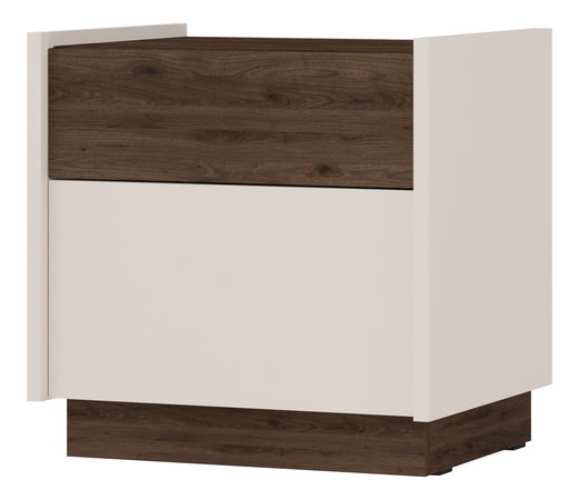 Nočný stolík Kabal (béžová + orech tmavý) je vyrobený z kvalitnej laminovanej dosky a HDF. Doska s hrúbkou 16 mm a zadná stena s hrúbkou 2,5 mm zabezpečujú odolnosť a pevnosť. Stolík má 2 zásuvky so systémom otvárania Push-to-open pre pohodlné používanie a moderný vzhľad.