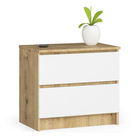 Nočný stolík Kalista (dub artisan + biela) je praktickým a štýlovým doplnkom pre vašu spálňu. S výškou 55 cm, šírkou 60 cm a hĺbkou 40 cm poskytuje dostatok miesta pre uloženie vašich osobných vecí a dekorácií. Vďaka kombinácii drevného dubu artisan a elegantnej bielej farby pôsobí stolík moderným a elegantným dojmom, ktorý sa hodí do každého interiéru. Jeho robustná konštrukcia zaručuje dlhú životnosť a pevnosť. Nechýba ani praktická zásuvka a police, ktoré vám umožnia udržiavať poriadok. Nočný stolík Kalista je ideálnou voľbou pre tých, ktorí hľadajú štýlový a funkčný nábytok do svojej spálne.