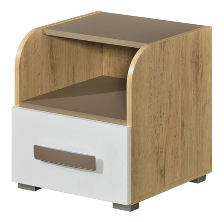 Nočný stolík. Na spodku sa nachádza 1 zásuvka a nad ňou sa nachádza polička.
