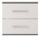 Nočný stolík Oleg II (biela + sivá) je moderné a minimalistické zariadenie s výškou 51 cm, šírkou 55 cm a hĺbkou 44 cm. Je vyrobený z drevotriesky s hrúbkou 16 mm a má ABS hrany s hrúbkou 0,5 mm. Jeho strieborné plastové úchyty a absencia nožičiek pridávajú stolíku elegantný vzhľad. S dvoma zásuvkami ponúka praktický úložný priestor pri posteli. Nočný stolík Oleg II je ideálnym doplnkom do vášho interiéru, ktorý kombinuje jednoduchosť a funkčnosť.