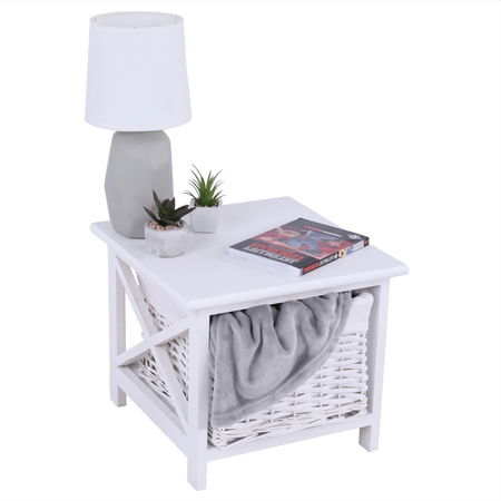 Nočný stolík je ideálny do každého interiéru, vďaka svojmu jednoduchému dizajnu a príjemnej bielej farbe. Úložný priestor je vo forme košíka.