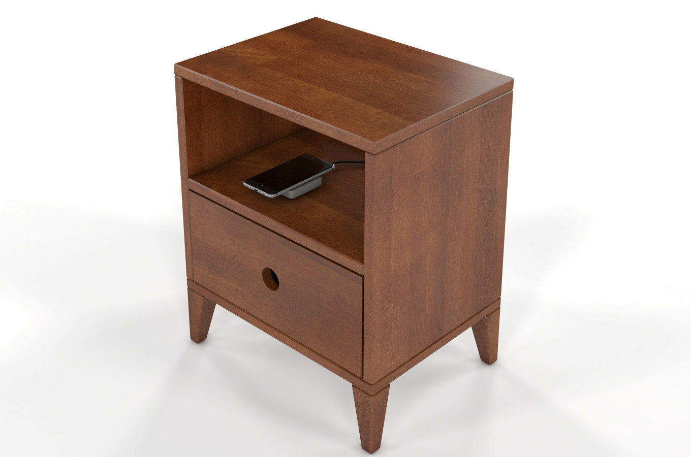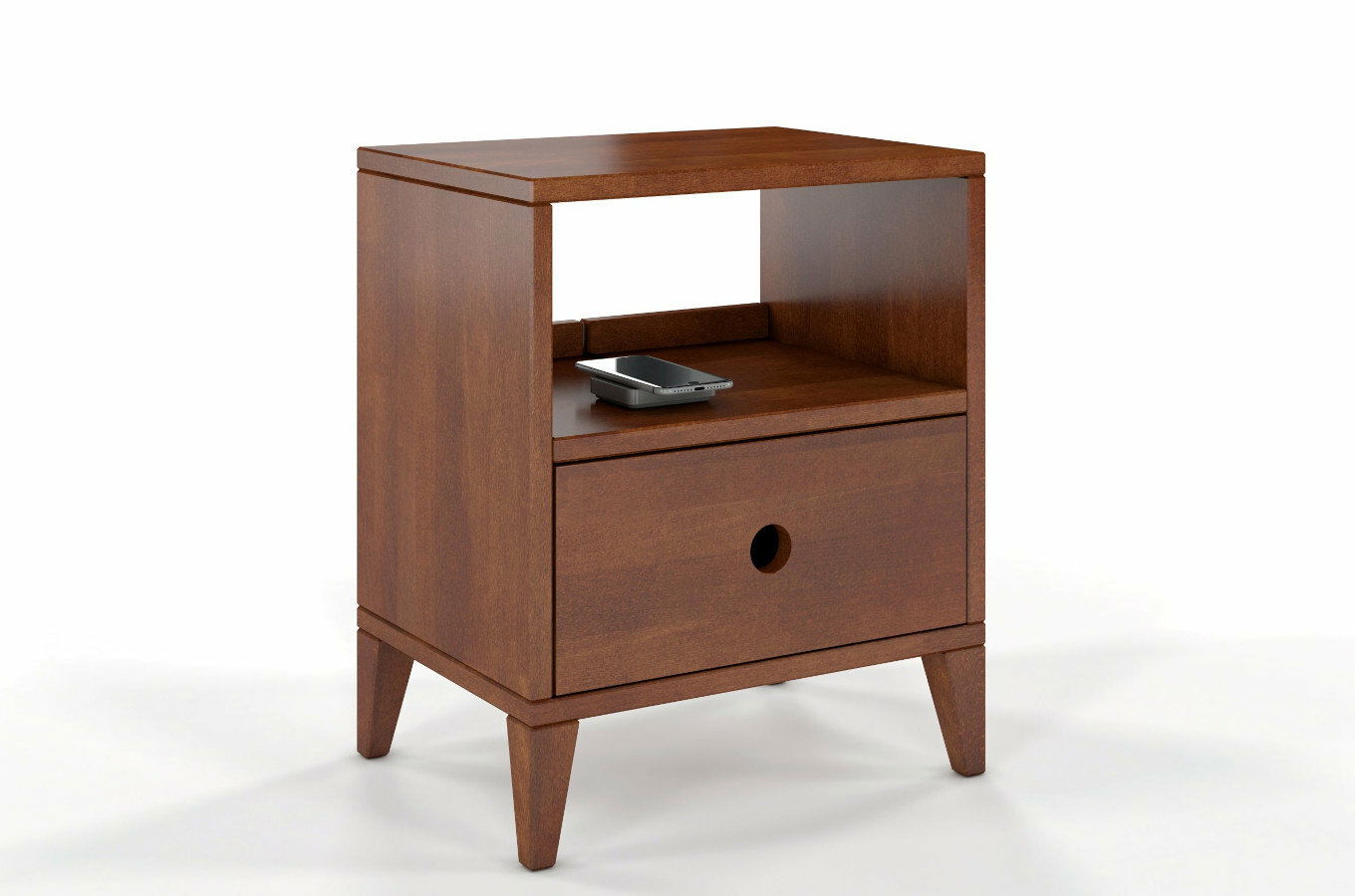 ZobraziťNočný stolík Scandinavian (orech) s výškou 50 cm a hĺbkou 35 cm je moderného tvaru a s nevtieravým štýlom. Stolík disponuje zásuvkou a otvorenou policou s lištou na zabraňovanie pádu predmetov a otvorom pre kábel nabíjačky. Nočný stolík je podopretý na šikmých drevených nožičkách, ktoré sú vhodnej výšky pre jednoduché upratovanie pod stolíkom. Je vyrobený z masívneho bukového dreva, prstovo spájaný a skrutkovaný, čo zaručuje odolnosť a dlhodobé používanie nábytku. Nočný stolík Scandinavian je dostupný v dvoch farebných prevedeniach a k nočnému stolíku sa odporúča zakúpiť aj posteľ z rovnakej radu. Farby na obrázku sa môžu mierne líšiť vo vzhľadu vzhľadom na individuálne vlastnosti každého kusu dreva a nastavenie monitora alebo displeja.