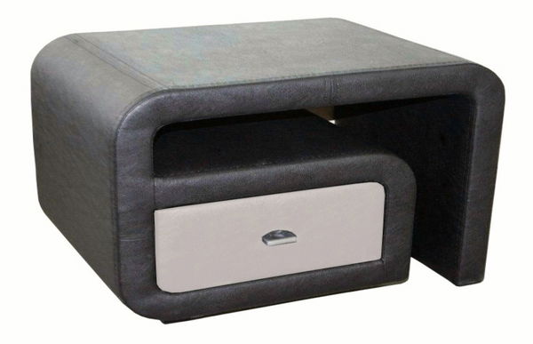 Čalúnený nočný stolík v prevedení čierna ekokoža so zásuvkou s frontom v béžovej farbe ekokože. Pravé prevedenie