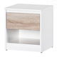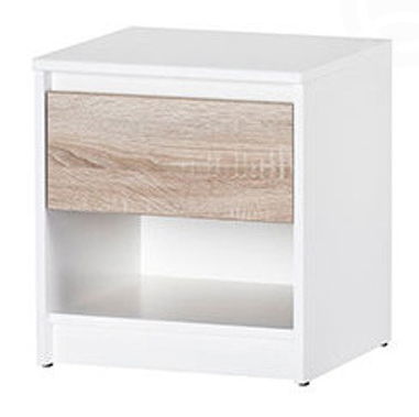 Nočný stolík z modernej kolekcie Venecia, je praktickým doplnkom ku každej posteli. Má bezúchytový systém. Je vyrobená z kvalitného LTD v bielom farebnom prevedení s pruhom vo farbe dub sonoma.