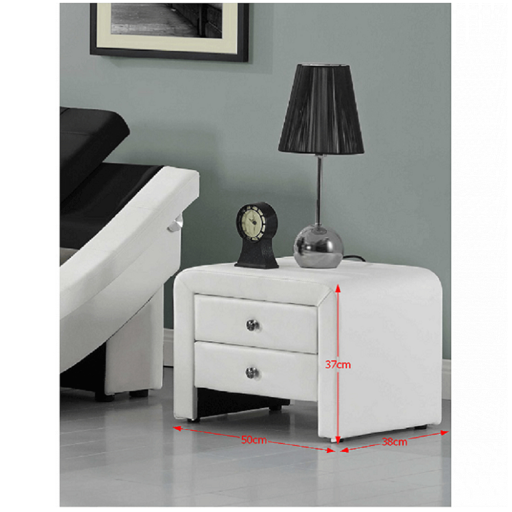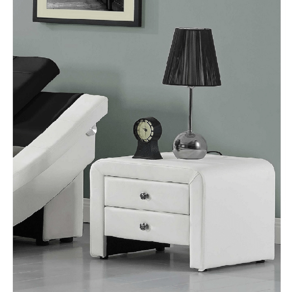Dizajnovo jedinečný nočný stolík je čalúnený ekokožou a madlá sú kovové. Dva šuflíky ponúkajú dostatočný úložný priestor. Nočný stolík stojí na malých nožičkách, ktoré sú šetrné k podlahe.