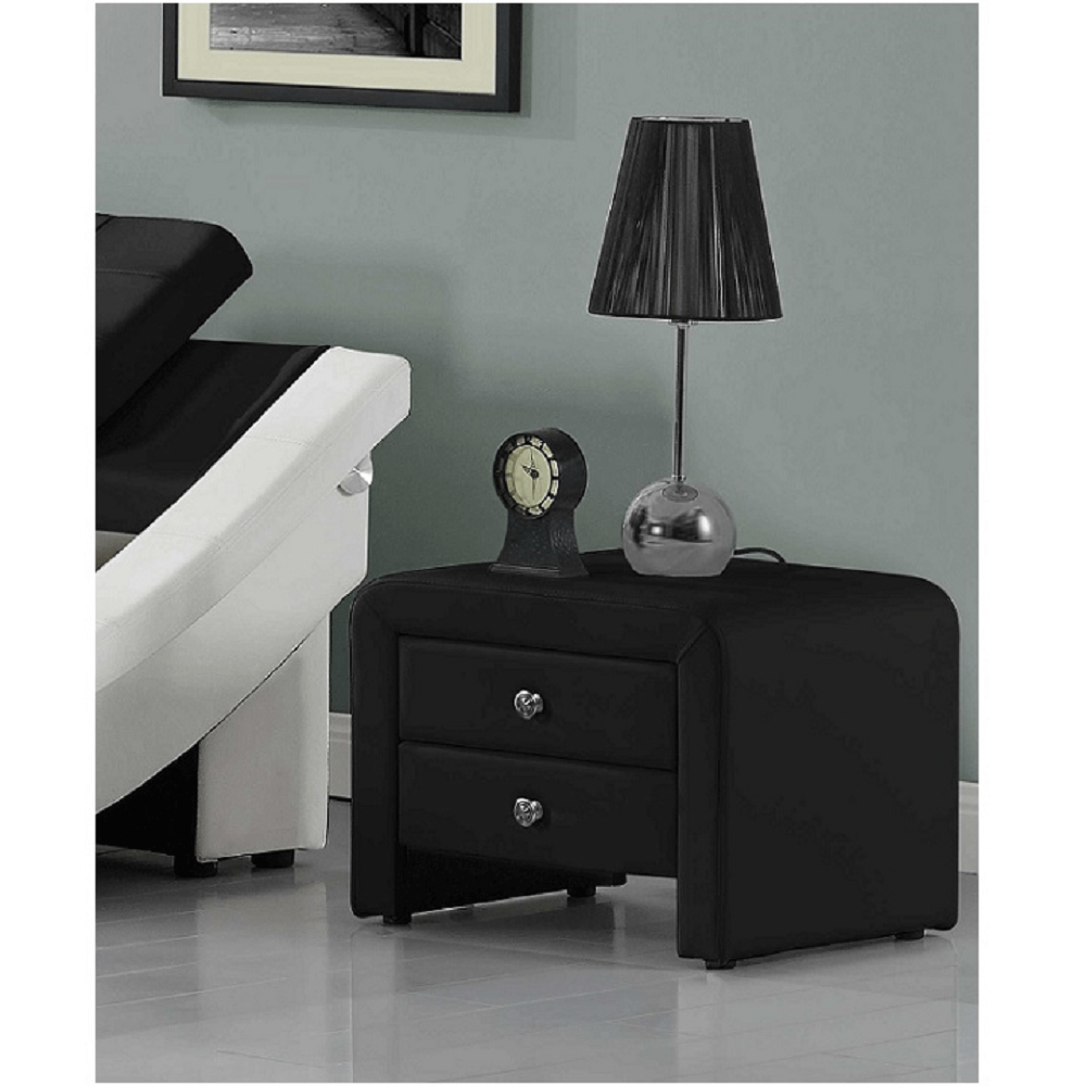 Dizajnovo jedinečný nočný stolík je čalúnený ekokožou a madlá sú kovové. Dva šuflíky ponúkajú dostatočný úložný priestor. Nočný stolík stojí na malých nožičkách, ktoré sú šetrné k podlahe.