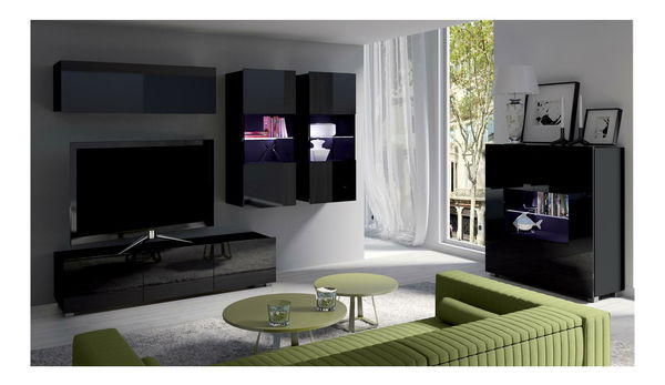 Obývacia izba Calabria 4 v čiernej matnej a lesklej úprave je dokonalou voľbou pre tých, ktorí túžia po interiéri s nádychom luxusu a elegancie. Kombinácia vitríny, dvoch závesných vitrín, širokého TV stolíka a decentnej police vytvára pôsobivý celok, ktorý vynikne v každom modernom priestore. Vizuálna hĺbka čiernej farby spolu s lesklými plochami dodáva miestnosti výnimočný charakter a šmrnc, zatiaľ čo praktické riešenia ponúkajú bohatý úložný priestor bez kompromisov v dizajne.