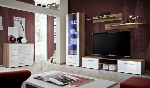 Obývacia izba Galino B je zložená z piatich prvkov a je vhodná do menších priestorov. Svojim dizajnom a jednoduchosťou však skvele zapadne do interiéru obývacej izby. TV skrinka má dvoje dvierka, na ktorých sú elegantné, 25 cm dlhé uchyty. V strednej časti je otvorený priestor na uloženie audio/video príslušenstva. Vysoká vitrína má sčasti presklené dvere a v dolnej časti dve zásuvky. Obsahuje tri sklenené, LED osvetlením podsvietené poličky. Samostatné poličky na stenu ponúkajú ďalší odkladací priestor na maličkosti. Presklené časti sú vyrobené z číreho tvrdeného skla. Nízka komoda obsahuje štyri praktické zásuvky.