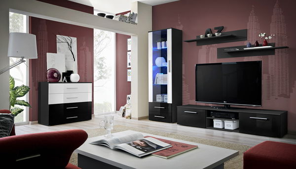 Obývacia izba Galino B je zložená z piatich prvkov a je vhodná do menších priestorov. Svojim dizajnom a jednoduchosťou však skvele zapadne do interiéru obývacej izby. TV skrinka má dvoje dvierka, na ktorých sú elegantné, 25 cm dlhé uchyty. V strednej časti je otvorený priestor na uloženie audio/video príslušenstva. Vysoká vitrína má sčasti presklené dvere a v dolnej časti dve zásuvky. Obsahuje tri sklenené, LED osvetlením podsvietené poličky. Samostatné poličky na stenu ponúkajú ďalší odkladací priestor na maličkosti. Presklené časti sú vyrobené z číreho tvrdeného skla. Nízka komoda obsahuje štyri praktické zásuvky. Všetky fronty sú v lesku.