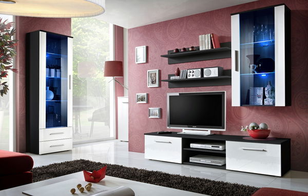 Obývacia izba Galino F je dizajnovaná na poskytnutie čo najviac úložného priestoru a pritom aby nezaberala veľa miesta v miestnosti. TV stolík má po stranách priestor uzavretý dvierkami a v strede otvorené miesto na uloženie audio a video príslušenstva. Vitrína na stenu má presklené dvierka a je efektne podsvietená LED osvetlením. Vo vnútri sú dve sklenené poličky. Odkladací priestor zväčšujú aj dve samostatne visiace poličky. Samostatne stojaca vitrína má v dolnej časti dve zásuvky a za presklenými dvierkami tri poličky. Sklenené časti sú vyrobené z tvrdeného skla. Všetky fronty sú v lesku.
