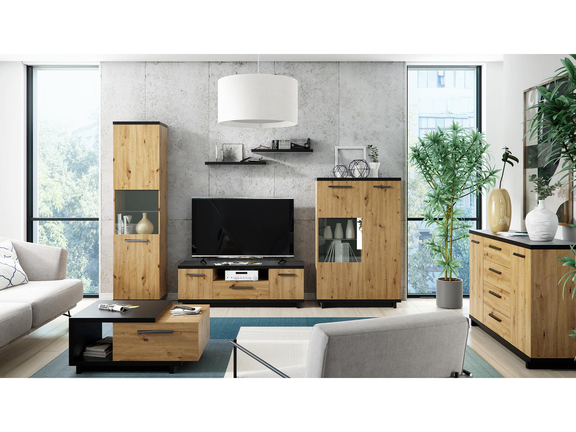 Premeňte svoj obývací priestor na štýlové a príjemné miesto so zostavou Indi 1 v kombinácii dub artisan a čiernej matnej farby. Elegantné vitríny s presklenými dvierkami, praktický TV stolík, komoda a konferenčný stolík vytvárajú dokonale zladený celok, ktorý poskytne dostatok úložného aj odkladacieho priestoru. Dve poličky navyše ponúkajú ideálne miesto na vaše obľúbené dekorácie. S touto kolekciou získate obývačku, ktorá pôsobí moderne, útulne a nadčasovo.