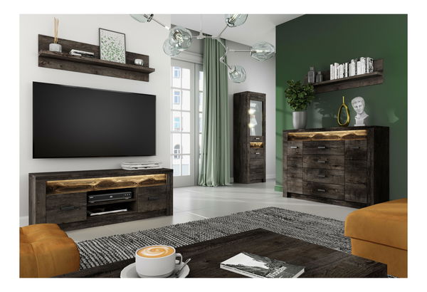 Obývacia izba Indie 1 v odtieni jaseň tmavý prináša do vášho interiéru elegantný a sofistikovaný vzhľad. Vitrína Indie 04 a komoda Indie 07 s LED osvetlením vytvárajú príjemnú atmosféru. TV stolík/skrinka Indie 09 je praktickým riešením pre vaše multimediálne potreby. Dve police Indie 11 a konferenčný stolík Indie 13 dopĺňajú túto štýlovú zostavu.