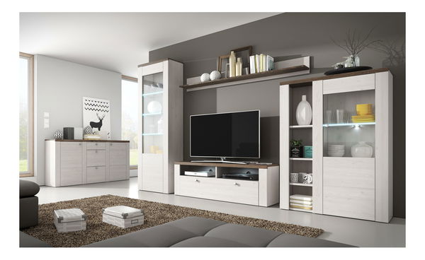 Obývacia izba Larita 1 v kombinácii sibiu larche a trufľového dubu sonoma pôsobí jemne romanticky, no zároveň moderne a s dôrazom na detail. Svetlé plochy vizuálne otvárajú priestor a vnášajú doň sviežosť, zatiaľ čo tmavší akcent dreva mu dodáva hĺbku a eleganciu. Dvojica vitrín s presklením vytvára ideálne miesto pre vaše obľúbené dekorácie či knihy, komoda a TV stolík sú zasa praktickým základom každodenného poriadku. Polička nadväzuje na celkový dizajn a dáva vám možnosť dotvoriť atmosféru podľa vlastného vkusu. Larita 1 je zostava, ktorá dokáže zútulniť interiér a zároveň ponúknuť štýlové riešenie pre funkčný a reprezentatívny obývací priestor.