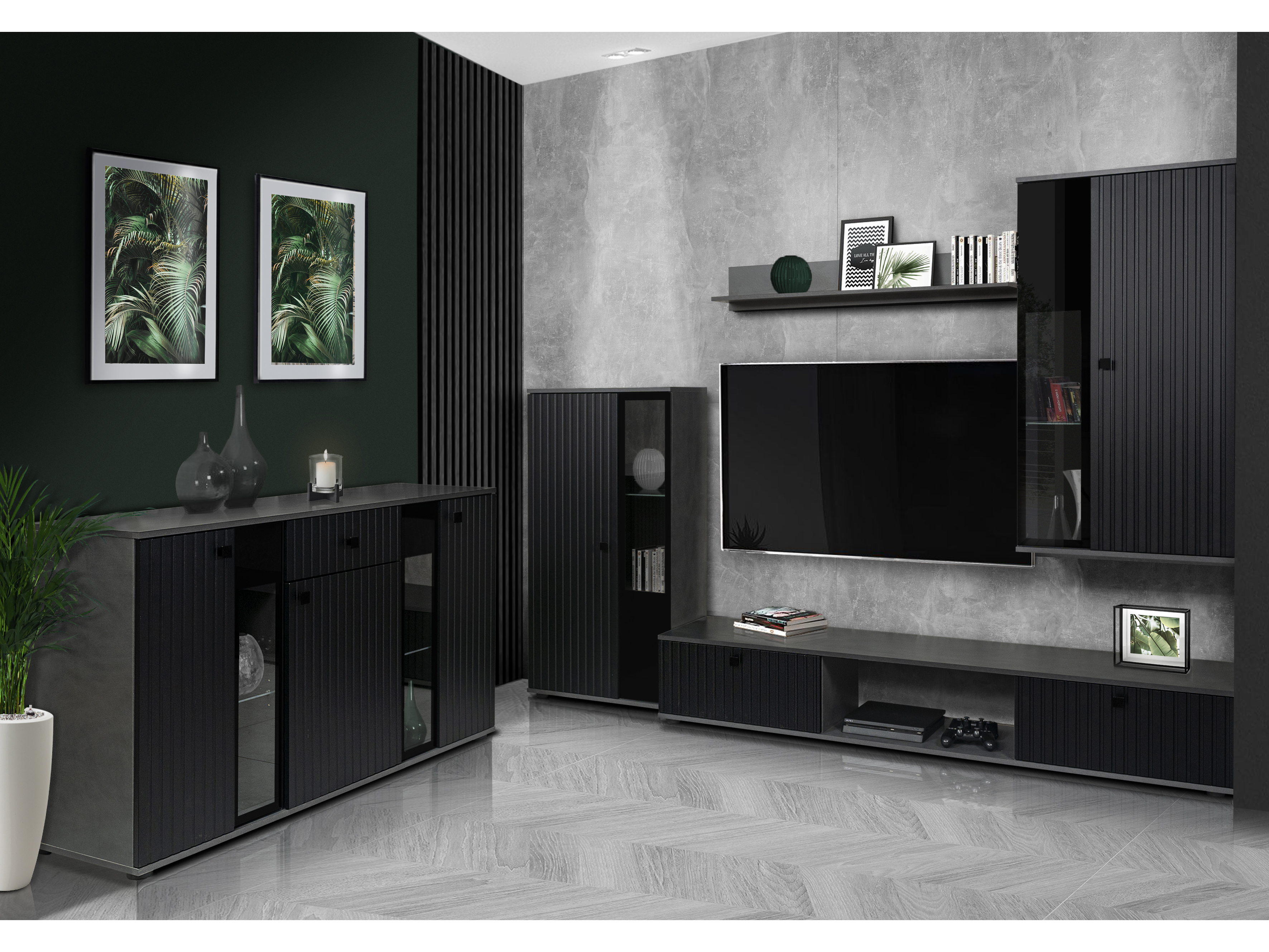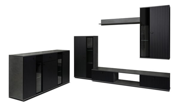 Obývacia izba Saul je priestor, kde sa funkčnosť snúbi s estetikou. Je to moderná a elegantná kolekcia nábytku, ktorá sa skladá z 5 prvkov. Vyrobená je z laminovanej dosky vysoko kvalitného materiálu, ktorá je odolnVyhotovená voči poškriabaniu a vlhkosti. Kolekcia sa skladá z 2 vitrín vrátane jednej závesnej, TV stolíka, závesnej police a komody. Frontové dosky sú vyrobené z MDF dosky (16 mm), korpus je vyrobený z laminovaných dosiek (15 mm) (melamín) a zadná strana je z HDF čiernej dosky (2,5 mm). Nožičky sú okrúhle čierne plastové s výškou 2 cm a úchytky sú čierne model GM 315 P-2. Sklo je tvrdené, brúsené a lakované na čierno s hrúbkou 4 mm. Police sú priehľadné s brúseným sklom a hrúbkou 5 mm. Systém otvárania zásuviek je guličkové vedenie (27 mm) a neobsahuje tichý dojazd. Rozmery jednotlivých prvkov sú: vitrína č.1 (š.v.h) 59,3x115x30,6 cm, vitrína č.2 (š.v.h) 59,3x113x30,6 cm, komoda (š.v.h) 140,4x80x40,2 cm, TV stolík (š.v.h) 175,5x27,7x40,2 cm, závesná polica (š.v.h) 102x16x17,5 cm. Balíky majú nasledovné rozmery: č.1 184,5x43,5x12,5 cm / 46,5 kg, č.2 125x41x10 cm / 24 kg, č.3 150x43,5x10 cm / 28,5 kg a č.4 85x50x10 cm / 18,8 kg. Je potrebnVyhotovená vlastná montáž. Ideálne pre každodenný život aj výnimočné chvíle.