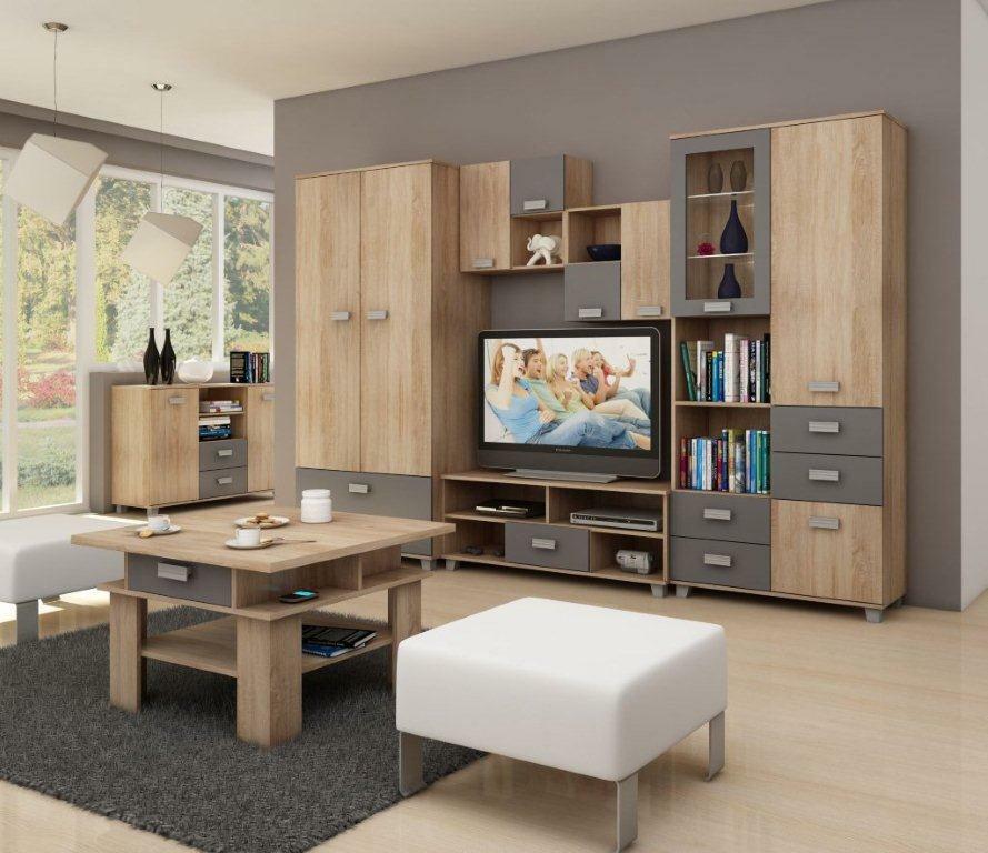 Obývacia izba Solomon sonoma + grafit vás očarí svojou harmóniou a praktickosťou. Je to moderný a elegantný nábytok pre váš obývací priestor. Skrinky a komody sú vyrobené z kvalitného dreva so sonoma dubovou a grafitovou farbou, čo dodáva celému nábytku štýlový vzhľad. Skrinky a komody majú dostatok úložného priestoru pre vaše veci a dekorácie. Kvalitné kovové úchytky na dverách a zásuvkách sú dokonalým doplnkom k dizajnu nábytku. + grafit bude dokonalým doplnkom vášho domova a prinesie do vášho obývacieho priestoru moderný šmrnc, no vytvára miesto plné pohody a vkusu.