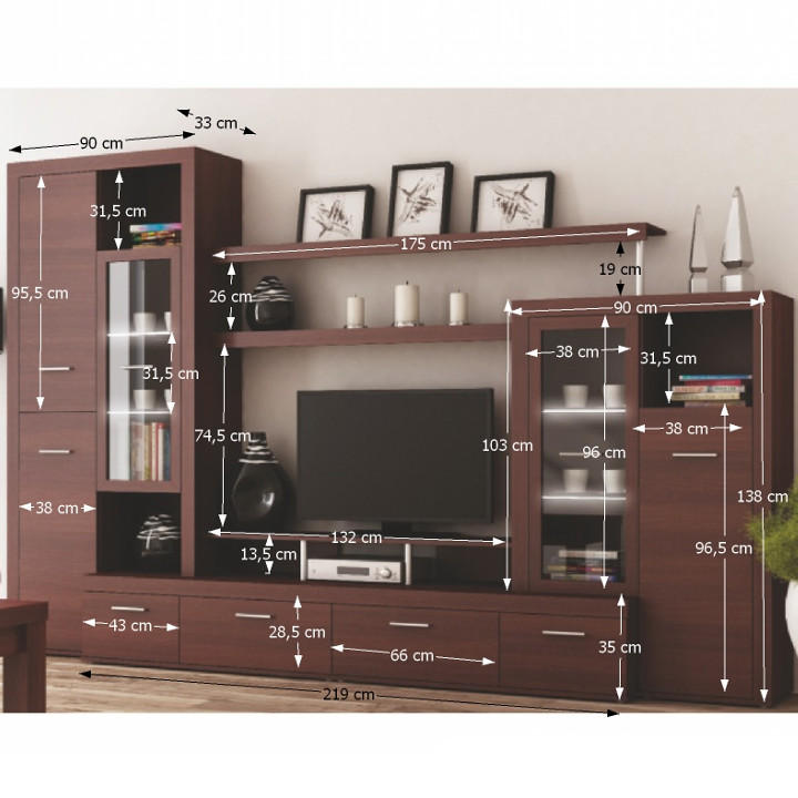 Elegancia do obývacej izby patrí a obývacia stena Adah s LED osvetlením v bielom tóne sa Vám o eleganciu postará. 2 osvetlené vitríny sú umiestnené po oboch stranách obývacej steny a dodávajú gaštanovému odtieňu švieži nádych. Na stene sú použité rovnako veľké šedé úchyty minimalistického rozmeru. Použitý odolný DTD materiál je laminovaný a presvedčí o svojej kvalite.