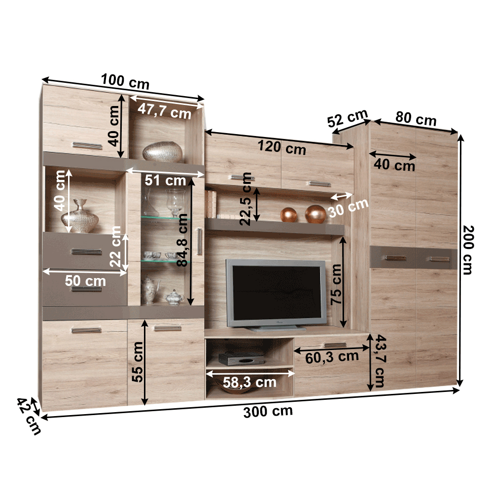 Ponúkame vám modernú obývaciu stenu Astovar s výškou 200 cm a hĺbkou 42-52 cm. Je vyrobená z DTD laminovaného materiálu v dub san marino/latte vysoký lesk HG farbe. Skrinka nad TV má šírku 120 cm, skrinka pod TV má rozmer 120x52x43,7 cm a skriňa s vitrínou má rozmer 100x52x200 cm. Celkový rozmer je 300x42-52x200 cm. Hrúbka materiálu je 16 mm. Táto obývacia stena je vešiaková s policou, čo vám umožní efektívne využiť priestor. Výrobok je vhodný pre každého, kto hľadá moderné a praktické riešenie pre svoju obývaciu izbu.
