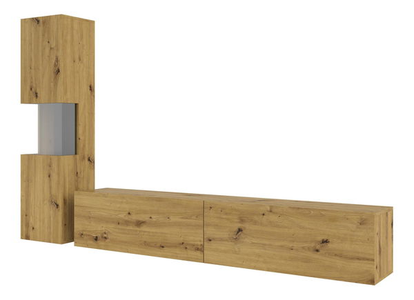 Obývacia stena Avernic Typ 09 (čierna + dub artisan) je dokonalou voľbou pre moderné obývacie izby. Tento kus nábytku sa skladá z vitríny Avernic Typ 05 a TV stolíka Avernic Typ 40, ktoré sú vyrobené z kvalitnej laminovanej dosky. Čierna a dub artisan farba dodávajú stene elegantný a štýlový vzhľad. Vitrína poskytuje dostatok úložného priestoru pre knihy, dekorácie alebo iné predmety. TV stolík disponuje policami na usporiadanie zariadenia a súčasne sa hodí pre televízny prijímač, hernú konzolu alebo DVD prehrávač. Obývacia stena Avernic Typ 09 je praktickým a funkčným doplnkom do vášho interiéru.