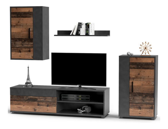 Jednoduchá a moderná obývacia stena Berno je praktickým kúskom pre každú domácnosť. S výškou 150 cm a šírkou 190 cm ponúka dostatok úložného priestoru pre vaše veci. Obývacia stena je zložená z dvoch skriniek, TV stolíka a poličky, čo umožňuje efektívne usporiadanie vášho priestoru. Závesná skrinka a komoda majú úložný priestor oddelený poličkou na dva odkladacie miesta, zatiaľ čo TV stolík disponuje otváracou skrinkou zhora, ktorá je vnútri rozdelená priečkou na dva úložné priestory. Na boku TV stolíka je otvorený priestor rozdelený poličkou na dve časti. Obývacia stena Berno v odtieni antracit + old style s hĺbkou 43 cm je kombináciou kvality, funkčnosti a moderného dizajnu pre vašu obývaciu izbu.