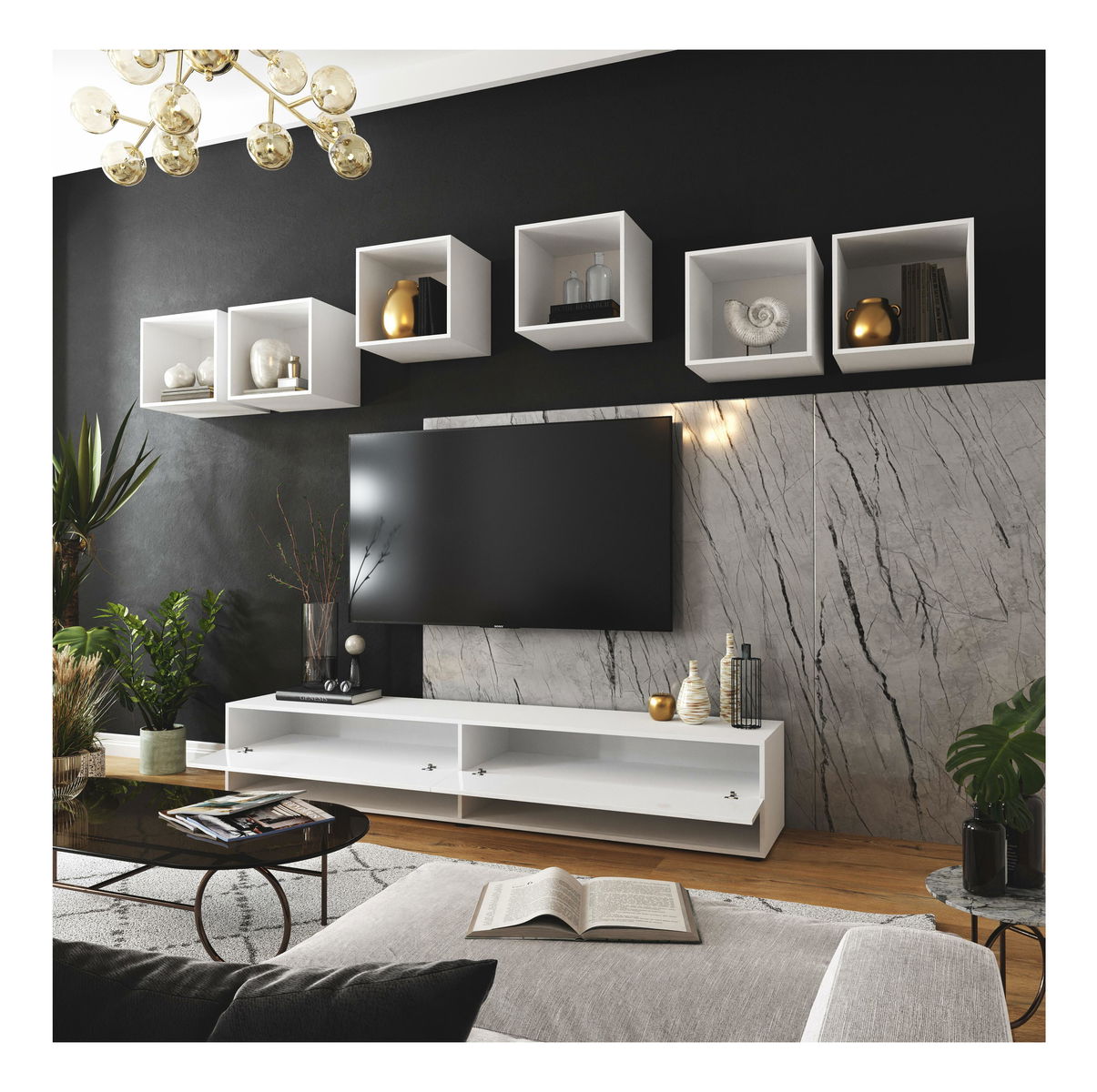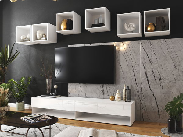 Biela obývacia stena Berny je skvelou voľbou do každej obývacej izby. Táto stena kombinuje funkčnosť a moderný vzhľad do dokonalého celku. Všetky dvierka majú dômyselný PUSH-CLICK systém, ktorý umožňuje ľahké otvorenie a zatvorenie. Táto zostava má tiež možnosť zakúpenia LED osvetlenia, ktoré dodá izbe ešte viac štýlu. Obývacia stena Berny sa môže umiestniť na stenu, čím opticky zväčší priestor a pridá ľahkosť miestnosti, alebo na podlahu s pomocou nožičiek. Materiál zostavy je MDF lakovaná pre predné časti a drevotrieska s hrúbkou 16 mm pre korpus. Spôsob otvárania dvierok je PUSH TO OPEN.