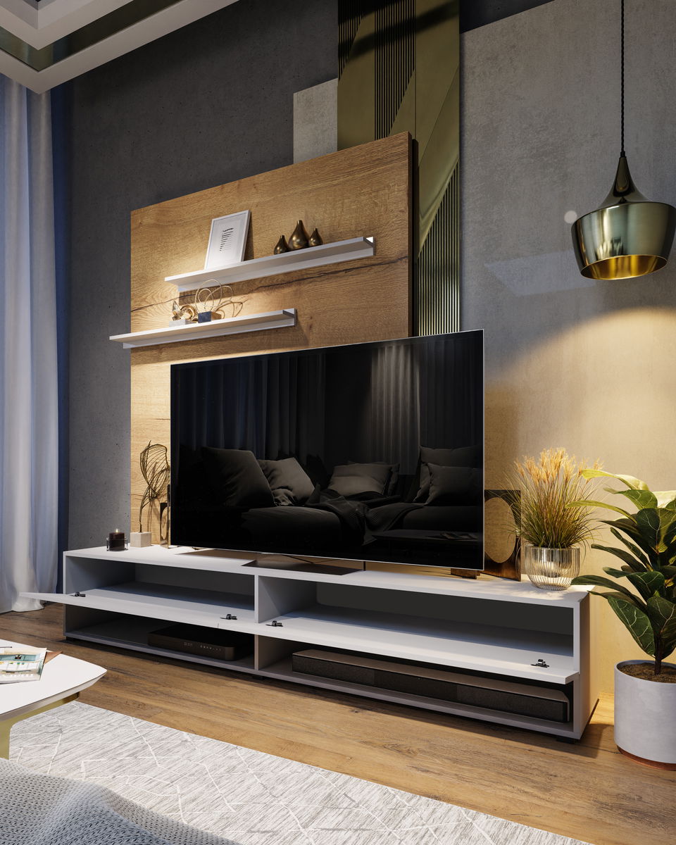 Obývacia stena Berny 33 (biela + biely lesk) je ideálnou kombináciou funkčnosti a dizajnu pre váš obývaci priestor. Systém PUSH-CLICK otvárania dvierok vám umožní pohodlné ovládanie bez potreby ťahania. Stenu môžete umiestniť na stenu pre optické zväčšenie priestoru alebo na podlahu pomocou nožičiek. Nábytok obsahuje RTV jednotku a závesnú policu E7, obidve v bielom lesku. Korpus je vyrobený z drevotriesky a predné panely sú z MDF lakovanej dosky. K stene je možné dokúpiť LED osvetlenie. Balík obsahuje 4 ks strieborných plastových nožičiek, ktoré sú potrebné pre montáž. Poznámka: Na zostavu je potrebné si dokúpiť 1 balenie nožičiek (4ks).