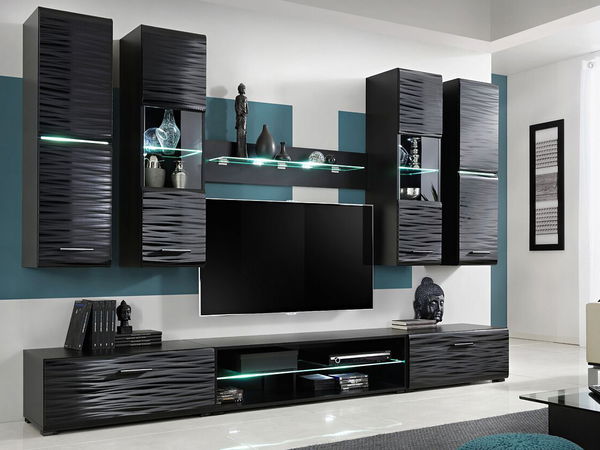 Moderná a štýlová obývacia stena, ktorá zaujme na prvý pohľad svojím vzhľadom a funkčonsťou. Obývacia stena je vyrobená z kvalitných materiálov, ktoré sú odolné voči poškriabaniu. Fronty majú 3D tvar čo vytvára jedinečnú atmosféru. Sklenené poličky sú podsvietené bielym LED osvetlením so zeleným nádychom. Sklenené poličky sú kalené a brúsené, teda spĺňajú všetky bezpečnostné normy EÚ. Túto obývaciu stenu dodávame v demonte, ktorú si ale dokážete jednoducho zložiť vďaka prehľadnému návodu.