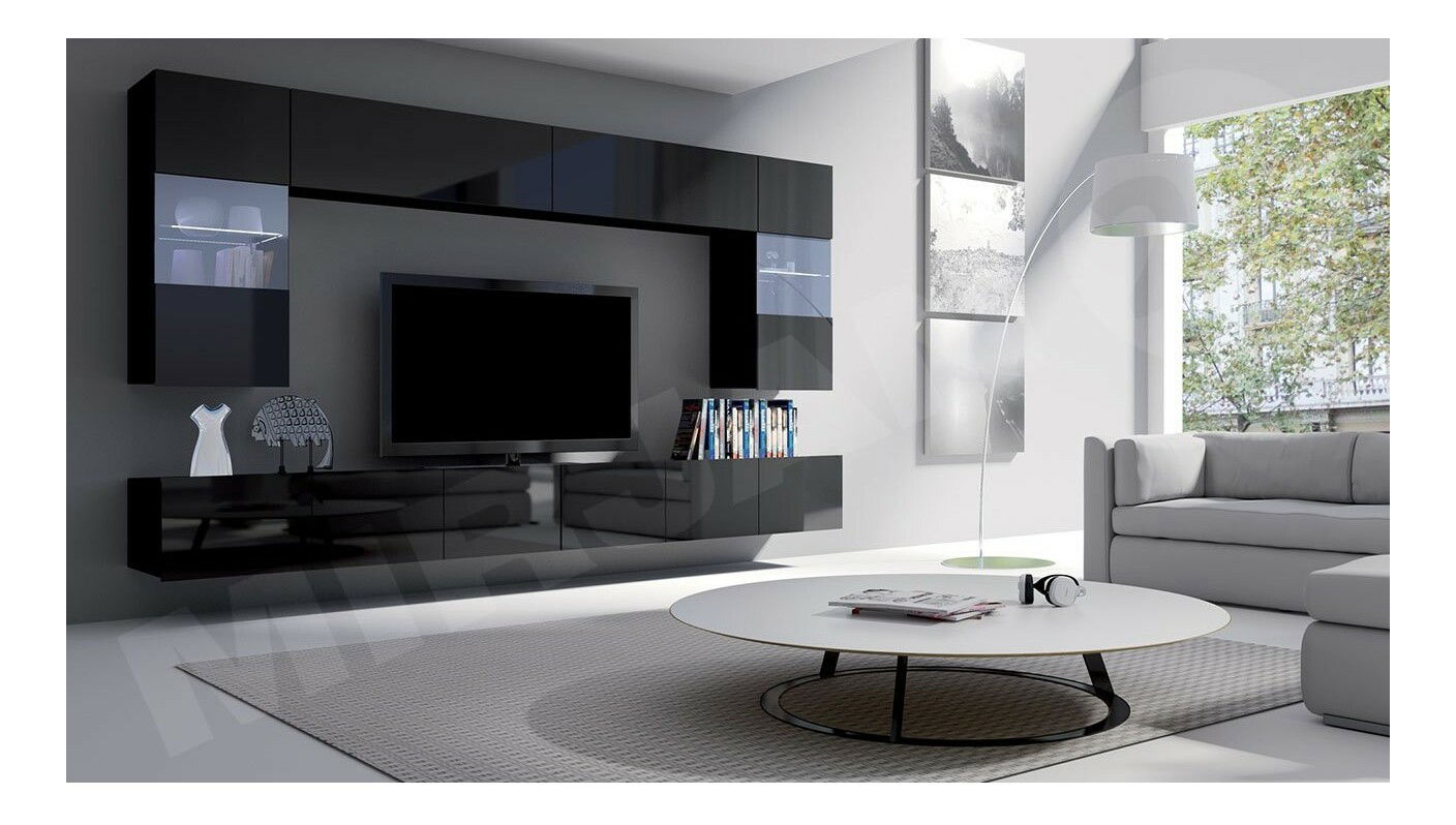 Obývacia stena Brolani I (čierna + lesk čierny) (s bielym LED osvetlením)
