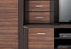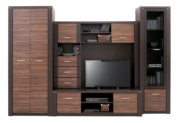 Veľká obývacia stena BRW Akona pozostáva z šatníkovej skrine, TV stolíka, nadstavbou nad TV stolík a vitrínou, ktorej poličky je možné podsvietiť.