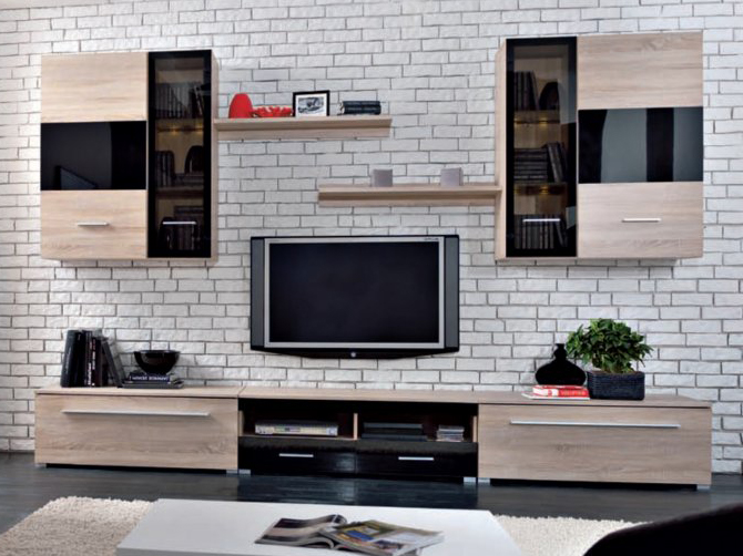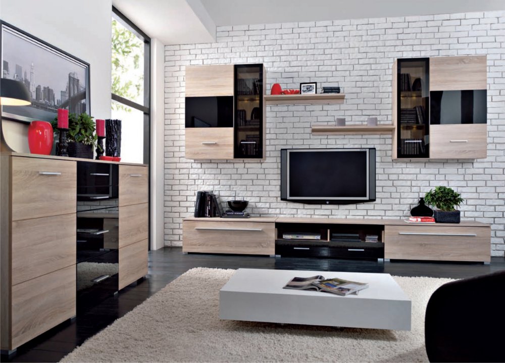 Vkusná obývacia stena Europa je v prevedení moderného dizajnu s aktuálne trendovým farebným prevedením Dubu sonoma a čiernym leskom. Značka Black Red White sa rozhodla pri tejto obývacej stene dodávať vitríny, TV stolík a poličky. Rozmiestnenie produktov je jednoduché a účelné čo je pri tejto obývacej stene cenená vlastnosť.