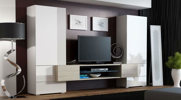Obývacia stena BRW Tor II biela + lesk + dub sonoma (s bielym osvetlením) *bazár