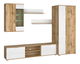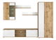 Táto obývacia stena Vám ponúka všetko čo potrebujete. V spodnej časti je umiestnená kombinovaná TV skrinka s dvoma uzavretými skrinkami po stránach a v strede nám vzniká priestor na audio/video techniku. Na ľavej strane je závesná skrinka ktorá je rozdelená a jedna jej časť má zrkadlové dvierka. Na pravej strane máme vysokú dvojdverovú stojacu skriňu, ktorá v sebe ukrýva jednu policu a priestor na zavesenie vašich ďalších vecí. V priestore medzi týmito skriňami sa nachádzajú dve police na ktoré si môžeme umiestniť dekorácie.