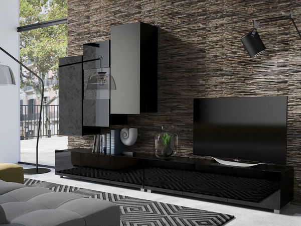 Obývacia stena Calabria 2 (čierna matná + lesk čierny) (s osvetlením)