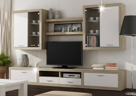 Elegantná obývacia stena Cancan je vyrobená z laminovanej DTD v kombinácii farieb dreva dub sonoma a pololesklej bielej. Je dodávaná s efektným LED osvetlením presklených častí vitrín s bielym podfarbením. To nielen zvýrazní predmety umiestnené v nich, ale aj navodí príjemnú atmosféru celého priestoru.