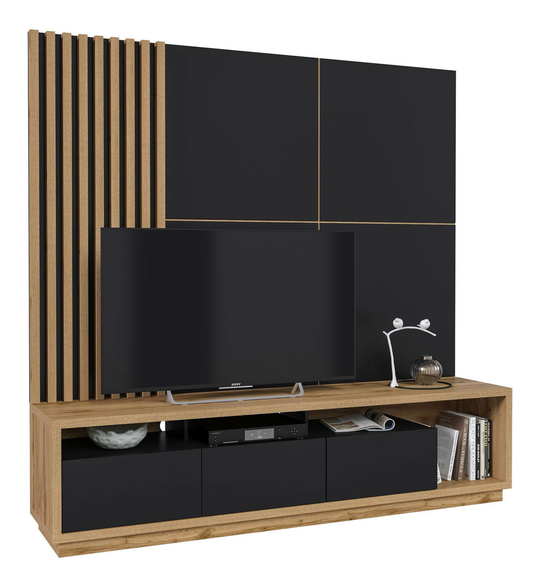 ZobraziťTáto elegantná obývacia stena kombinuje praktickosť a moderný dizajn, ideálne pre každý interiér. Vyrobená z kvalitnej laminovanej drevotriesky s ABS hranami, trvá životnosť a odolnosť voči opotrebovaniu. TV stolík poskytuje priestor pre audio a video zariadenia a obsahuje tri zásuvky, ktoré poskytujú úložný priestor na všetky vaše potreby. Vďaka bezúchytkovému systému si zachováva čistú líniu a minimalistický vzhľad. Nástenné panely dopĺňajú dizajn celej steny a vytvárajú konzistentný vzhľad.