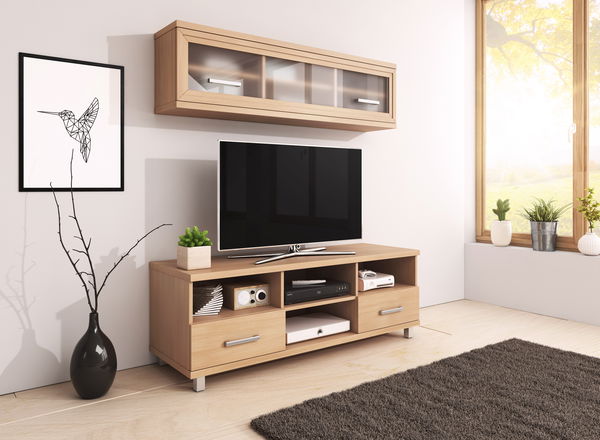 Táto jednoduchá, moderná obývacia stena bude spestrením vašej obývačky. Jej súčasťou je TV stolík a polička. Je to obývacia stena, ktorá je ideálna aj do menších interiérov. Získať ju môžete vo farbe javor alebo javor-amari. Úchyty a nožičky sú zase v príjemnom zlatom prevedení. Nájdete v nej dostatok úložného priestoru na vaše audio/video prehrávače alebo nosiče.