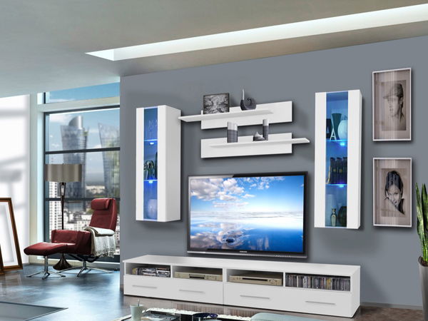 Jednoduchý a moderný dizajn obývacej steny je doplnený o systém push-click, ktorý je využitý pri vitríne. Obývacia stena je doplnená o LED podsvietenie.