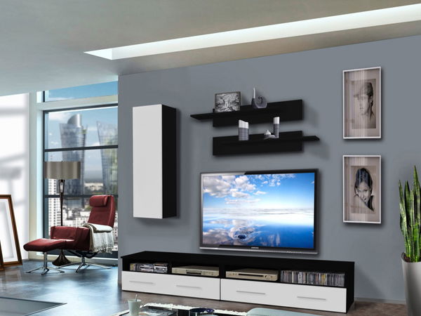 Jednoduchý a moderný dizajn obývacej steny je doplnený o systém push-click, ktorý je využitý pri skrine na stenu.