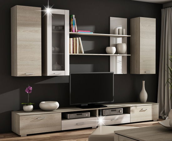 Krásna obývacia stena, ktorá navodí prírodnú atmosféru vo Vašej obývacej izbe. To najmä vďaka farebnému prevedeniu vo farbe dreva dub sonoma. Modernosť dodávajú prvky v bielej. Je vyrobená z kvalitnej laminovanej DTD.