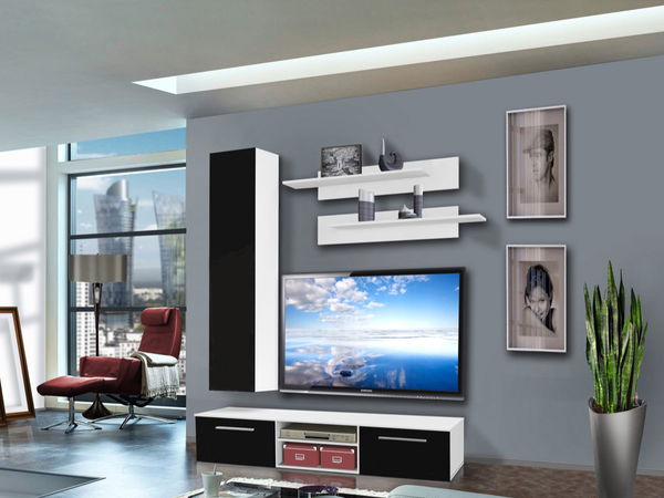 Jednoduchý a moderný dizajn obývacej steny je doplnený o systém push-click, ktorý je využitý pri skrine na stenu.