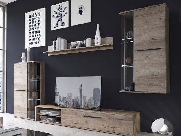 Moderná obývacia stena, ktorá si zakladá na najmodernejších trendoch bývania. Je vyrobená z kvalitného lamina. Korpus aj dvierka sú vo farbe dub šedý. Vo vitrínach sú sklenené poličky. Za príplatok je možné si objednať efektné LED osvetlenie vitrín.