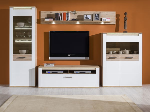 Rovné línie obývačiek sa udomácnili v mnohých domácnostiach a získavajú si stále viac zákazníkov. Zabudované LED osvetlenie v skrinkách dodáva nábytku výnimočný vzhľad a poslúži Vám aj ako samostatný svetelný zdroj. Charakteristickým znakom je reliéfovaná lišta pod osvetlením. Bezpečnostné sklo vydrží omnoho väčšiu záťaž ako obyčajné. Pri rozbití Vám nehrozí poranenie. Vhodný dizajn a kvalitný materiál úchytky uspokojí aj tých najnáročnejších. Zásuvky obsahujú praktický samodoťah a brzdu. Osvetlenie panelov, vitrín a sklenených políc je objednateľné samostatne.