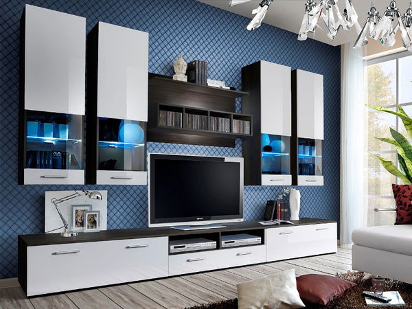 Obývacia stena moderného charakteru je dizajnovaná pre poskytnutie čo najväčšieho úložného priestoru. Štyri závesné vitríny sú uzavreté dvierkami, ktoré sú sčasti presklené. Vo vnútri sa nachádza jedna sklenená a jedna klasická polička. Efektne sú podsvietené LED osvetlením. Bočné TV skrinky majú úložný priestor rozdelený na dve časti. Stredná má zásuvku a otvorený priestor na uloženie TV príslušenstva. Panel s poličkami je pasívne podsvietený a okrem poličky sa na ňom nachádza aj regál na CD alebo ozdobné veci.