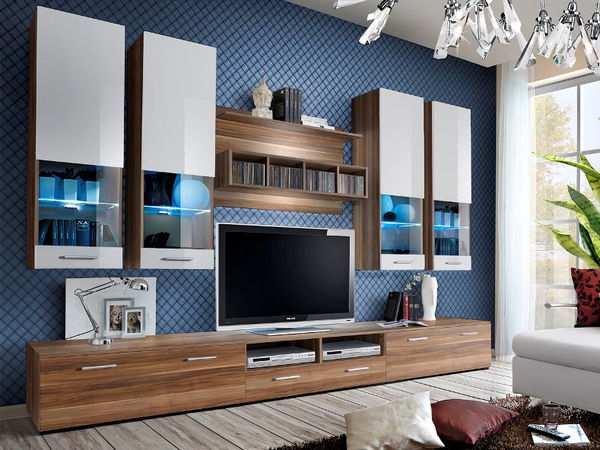 Obývacia stena moderného charakteru je dizajnovaná pre poskytnutie čo najväčšieho úložného priestoru. Štyri závesné vitríny sú uzavreté dvierkami, ktoré sú sčasti presklené. Vo vnútri sa nachádza jedna sklenená a jedna klasická polička. Efektne sú podsvietené LED osvetlením. Bočné TV skrinky majú úložný priestor rozdelený na dve časti. Stredná má zásuvku a otvorený priestor na uloženie TV príslušenstva. Panel s poličkami je pasívne podsvietený a okrem poličky sa na ňom nachádza aj regál na CD alebo ozdobné veci.