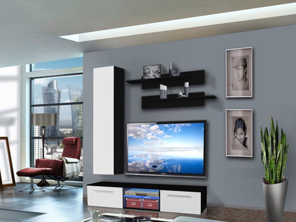 Jednoduchý a moderný dizajn obývacej steny je doplnený o systém push-click, ktorý je využitý pri skrine na stenu.