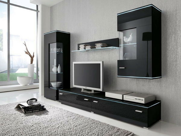 Moderná obývacia stena Essen je vyrobená z tých najkvalitnejších materiálov. Všetky komponenty tohto nábytku sú vyrobené v Nemecku. Korpus je matnej čiernej farby, pričom dvierka sú vo vysokom lesku. Presklené časti vitrín sú z číreho skla a je možné si priobjednať efektné RGB osvetlenie, pri ktorom máte možnosť vybrať si až z deviatich rôznych farieb podsvietenia. Vďaka tomu si môžete podľa nálady meniť atmosféru miestnosti. Ak by Vám nestačil ponúkaný úložný priestor, je možné si priobjednať vitrínu Essen.
