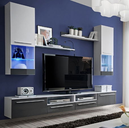 Moderná obývacia stena, ktorá oživí každý priestor. Výhodou tejto zostavy je, že všetky spodné skrinky, vrátane komody, ktorú si môžete priobjednať, obsahujú aj nožičky na postavenie na podlahu, tak aj závesné zariadenie na umiestnenie na stenu. Je vyrobená z kvalitného lamina. Korpus aj dvierka sú vo farbe alpská biela s leskom v kombinácii so šedou lesklou farbou antracit. Poličky vo vitrínach sú podsvietené efektným osvetlením. K obývacej stene je možné si priobjednať komodu Evora.