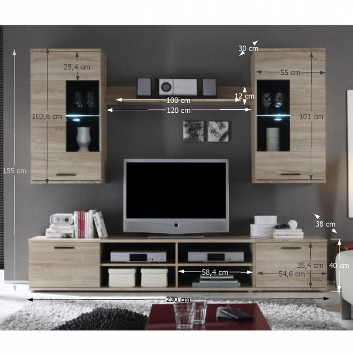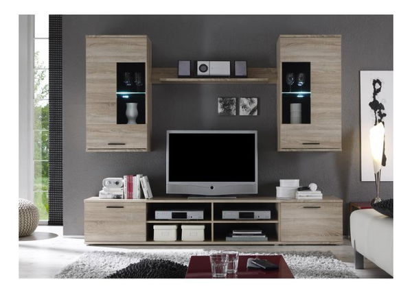 Jednoduchá obývacia stena v bielej farbe. Na stenu sa umiestňuje vitrína poličkami. Nad TV sa umiestňuje jednoduchá polička. TV sa pokladá na TV stolík, ktorý má na pravej strane barovú vyklápaciu skrinku a vedľa nej 4 poličky na audio/video. Vedľa TV stolíka môžete umiestniť vitrínu s jednými dvierkami.